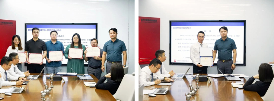 会上,李总为项目老师颁发了授权书,为各项目小组负责人颁发了任命书,共同宣誓投身变革。