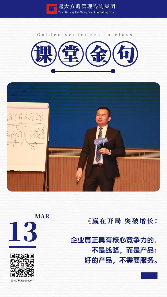 课上老师采用“道、法、术、器”相结合的形式给学员们带来了一场精彩的知识盛宴。3月13日的课堂上两位老师也总结了很多金句,可以很好的运用到企业的经营管理中。为了帮助大家更好的吸收和巩固两天的学习,小编整理了今天课程雷老师的部分金句分享给大家,希望能给大家带来更多启发。