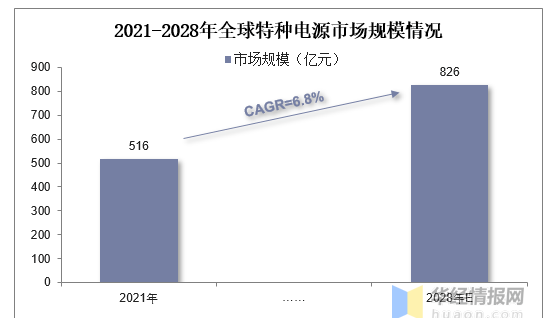 特种电源是指具有不同于普通电源的特殊指标(如高压输出、特大电流输出、脉冲输出等)和特殊用途的电源装置。据NT Cysd数据,2021年全球军用电源市场规模大约为516亿元,预计2028年将达到826亿元,2022-2028期间年复合增长率为6.8%。