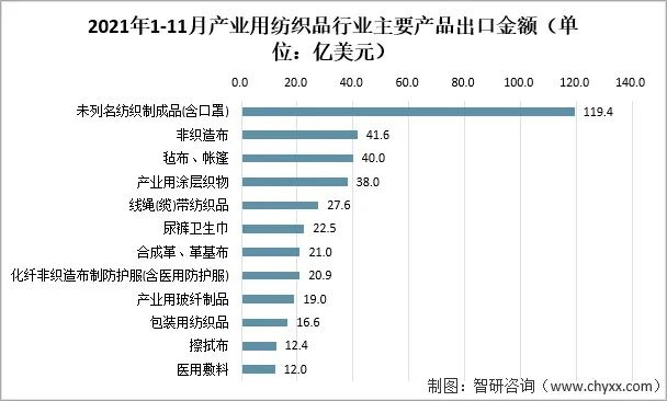 根据中国海关数据,2021年1-11月我国产业用纺织品主要出口产品(按出口金额排名前十二类产品)的出口额为391.1亿美元,同比下降53.0%。分产品来看,未列名纺织制成品(主要为口罩)目前是行业最大的出口产品,出口金额为119.4亿美元,但因国外对口罩需求的大幅回落其出口额较上年同期下降了77.0%;毡布/帐篷、产业用涂层织物等传统产品的出口额分别为40.0亿美元和38.0亿美元,同比增长52.7%和33.6%;合成革及革基布的出口额为21.0亿美元,同比增长44.7%。非织造布及相关制品的出口呈现不同走势,卷材出口41.6亿美元,同比下降9.0%,出口量126.0万吨,同比小幅上涨0.8%,出口均价同比下滑9.8%;化纤非织造布制防护服(含医用防护服)出口20.9亿美元,同比下降80.2%;一次性卫生用品出口22.5亿美元,同比增长10.5%。
