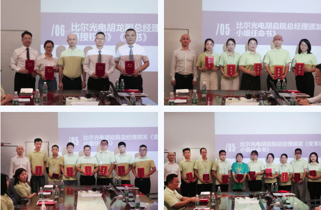 为促进项目的有效落地,明确各岗位职责,强化责任意识,会上比尔光电领导为远大方略项目组颁发了授权书,为老师和变革小组的核心成员颁发了聘书。
